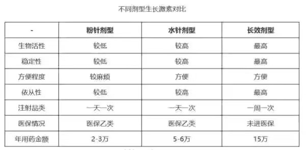 市面上的注射生长激素分为粉剂和水剂。水剂分为长效水剂(一周一次)和短效水剂(每天一次)。一年花费大约在6-10万左右。打三年,就是半辆特斯拉的钱。