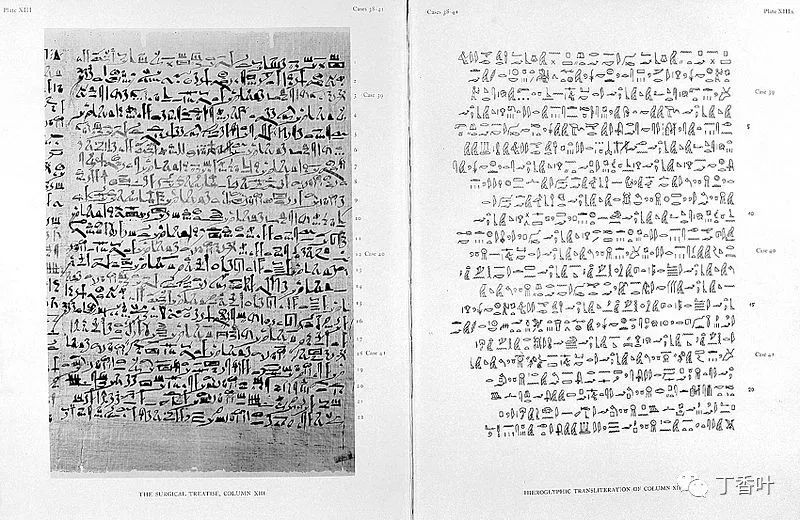 Breasted版(1930 年):左页纸莎草纸原版照片,右页象形文字转录。这是图 XIII(第 13 栏,案例 38-41)