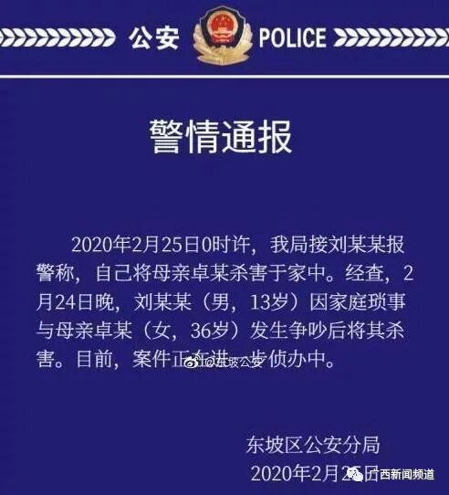 今年2月,四川眉山,一名13岁的男孩将自己36岁的母亲杀害于家里,而杀人的原因竟然是跟母亲吵架;