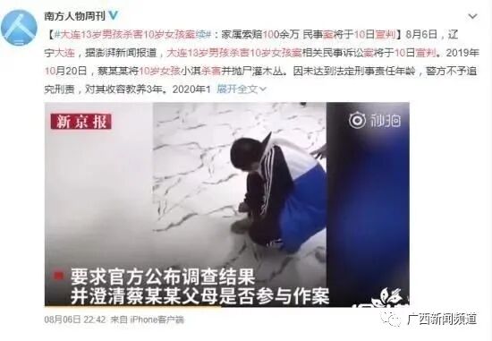 2019年10月20日,大连13岁男孩在家中将10岁女孩杀害,并抛尸灌木丛;