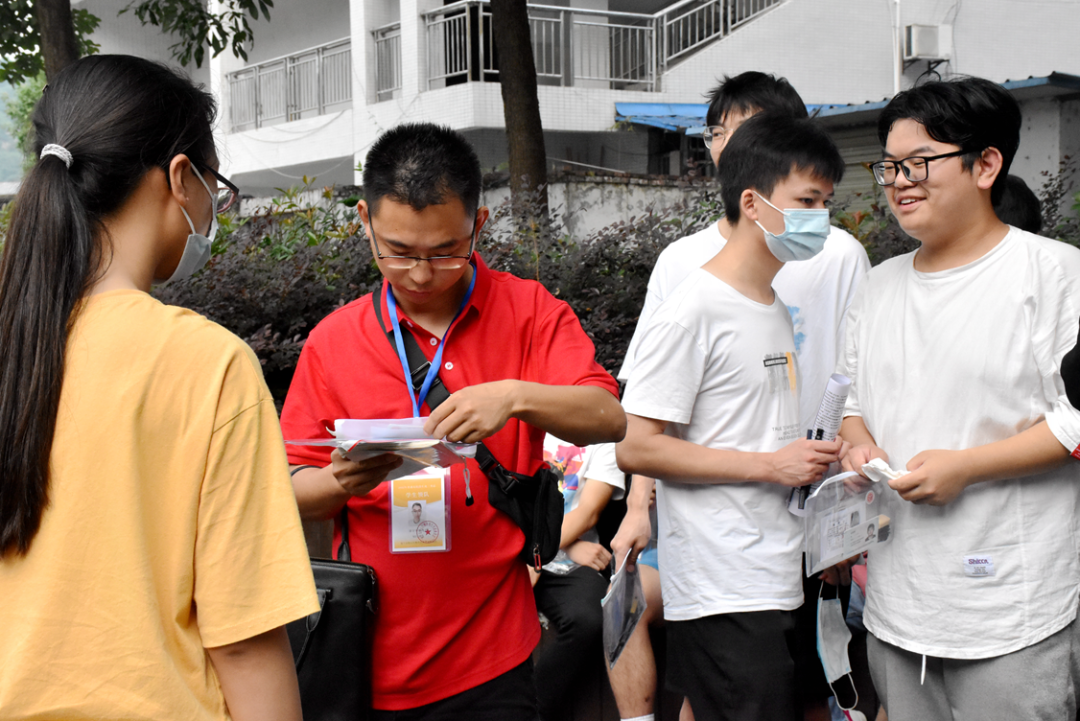 △遂宁一中和高级实验学校的班主任正在给考生分发准考证和讲解考场规则