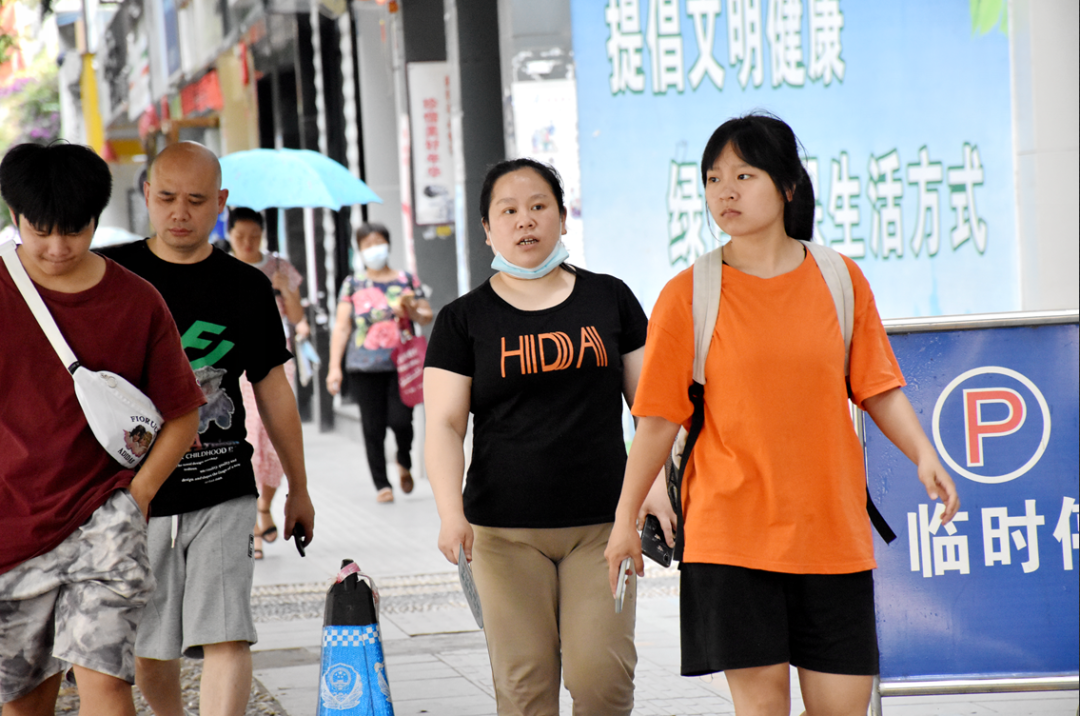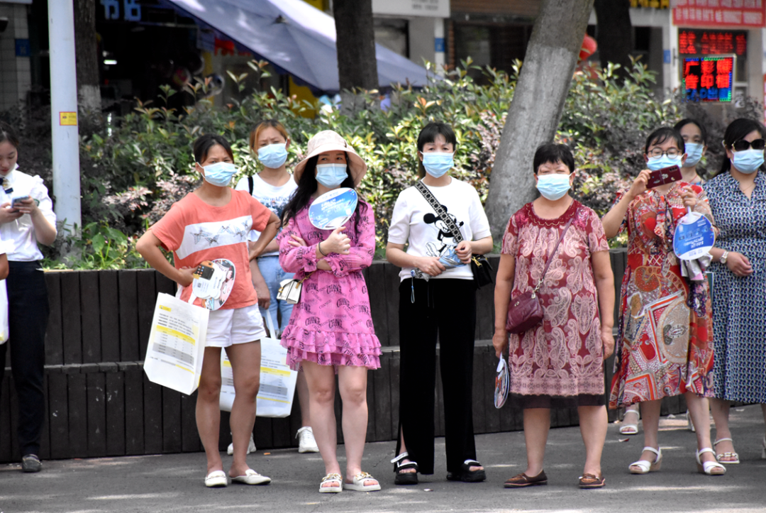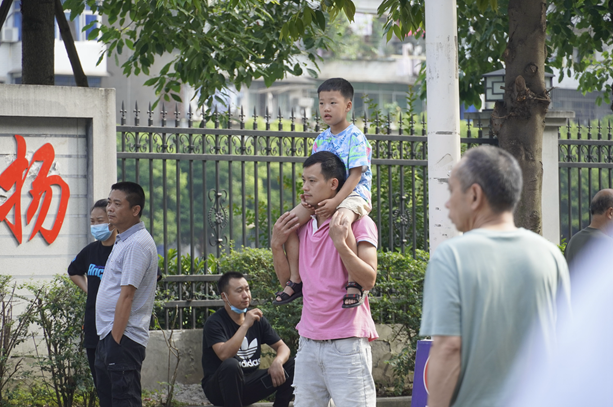 △烈日炎炎下,遂宁中学考点外陪考家长