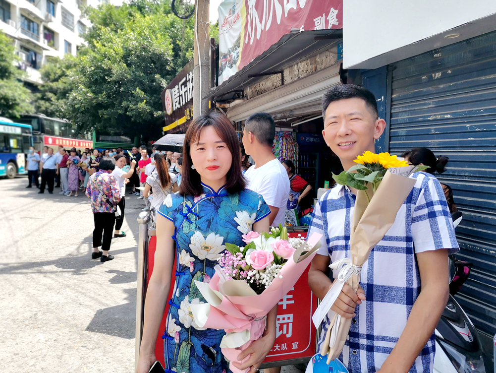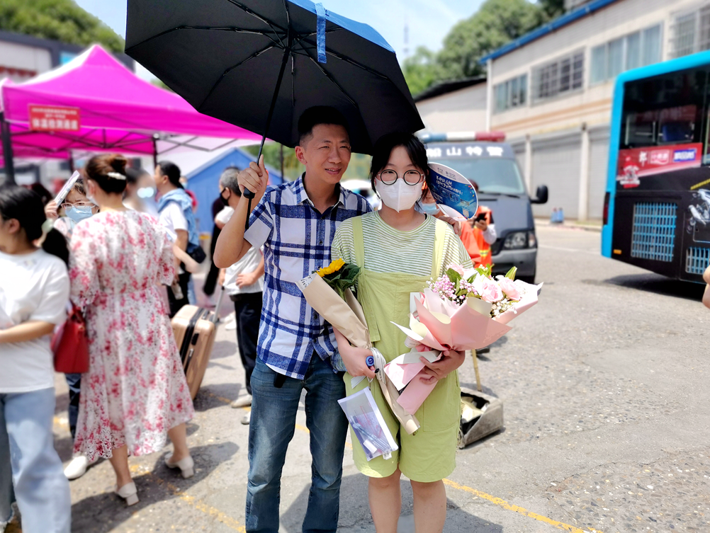 △家长带着向日葵给孩子热烈地拥抱,祝愿孩子一举夺魁