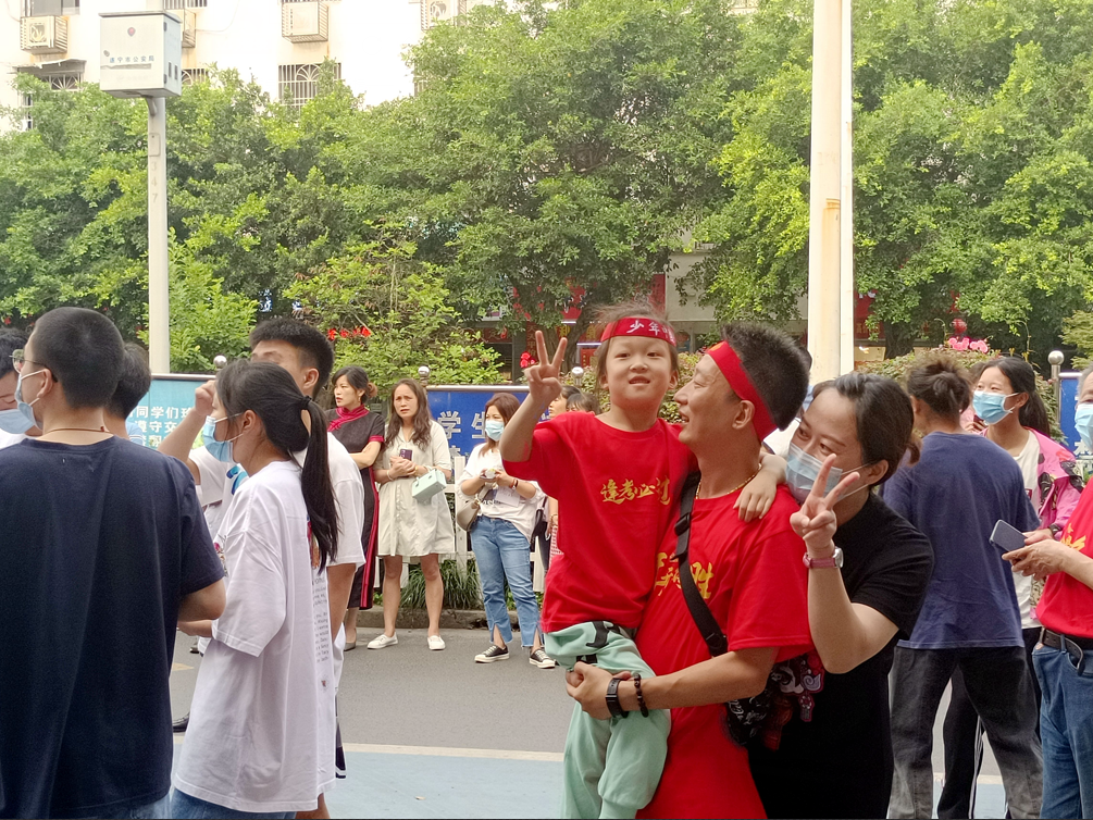 △二中考点外,头戴鼓励的妹妹和父母正在等待考生