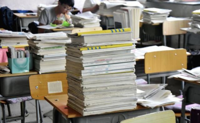 课桌上的试卷和复习资料堆得很高
