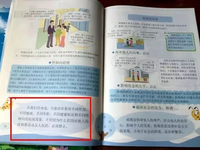 三年级下册的课本就讲解了青春期男孩女孩会出现的遗精、月经等现象,到了五年级下册,教材就会引入性取向的概念,并且告诉孩子们同性恋也是正常的,不能因为性倾向对他人歧视!