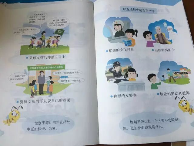 除此以外,教材还罕见地出现了这样一些内容:“男孩和女孩同样独立自主,同样发表自己的意见”“男性和女性都负责、担当,都可以勇敢主动,都可以细心体贴”。