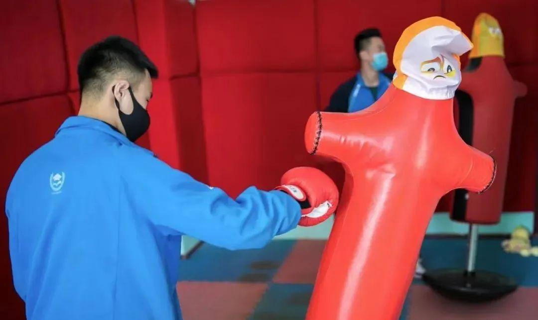 2020年4月9日,呼和浩特第26中学学生在情绪宣泄室击打“充气人偶”。视觉中国供图