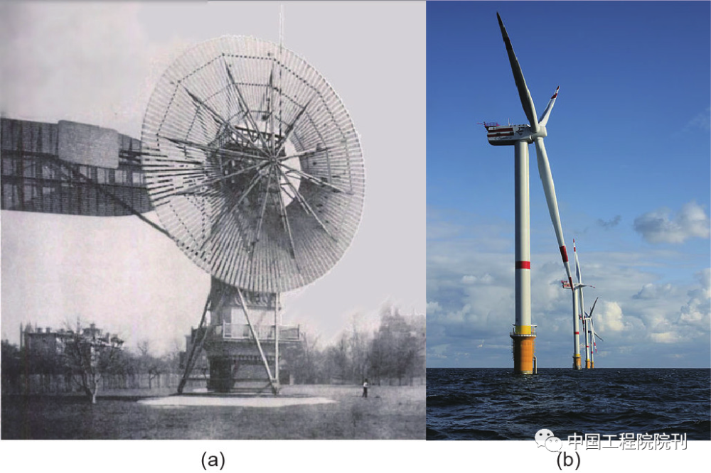 图2 风力涡轮机技术的进化。(a)Charles F.Brush的发电风车,建于1887—1888年(图片由维基百科提供);(b)位于比利时北海桑顿浅滩的现代海上风电场,由瑞普尔(Repower)生产的5MW轴流式涡轮机组成(图片由Hans Hiller提供,来自维基百科)
