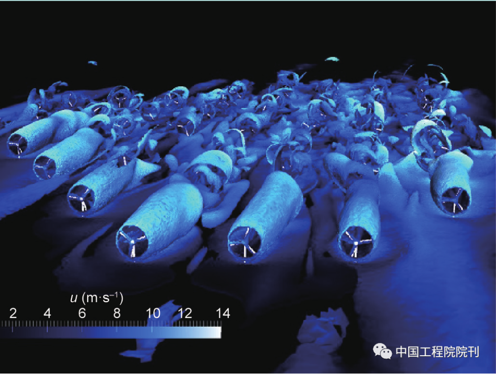 图3 Lillgrund海上风电场的计算流体动力学(CFD)大涡模拟3D图。(图片由爱丁堡大学的Angus Creech博士提供)