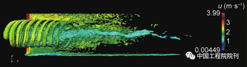 还有一些有趣的研究主要集中在不确定性、湍流、涡流、波流相互作用、模型放大和环境影响(如对哺乳动物和生物多样性的影响)上。例如,暴风雨诱导的波浪可以产生比潮汐流还大的水质点速度。此外,波浪周期与涡轮机转子的周期是同阶的。湍流和大规模涡流可以对来流的一致性产生影响。这些都可以通过计算机模拟技术来完成预测。研究人员最近通过CFD解决了设备实际规模下潮汐和洋流涡轮机的湍流问题。在近期模拟(图5)中,转子叶片背后重现湍流旋流流动,形成与下游涡轮机和局部环境相互作用的尾迹。高性能、大数据计算能够使这样的3D计算模型在未来作为常规工具得到推广。