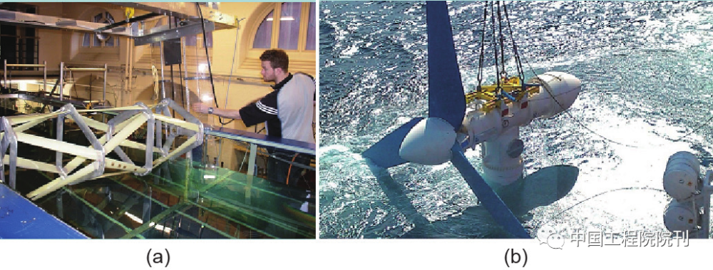 图6 潮汐设备测试。(a)THAWT设备的实验室模型(http://www.keplerenergy.co.uk/);(b)欧洲海洋能源中心的1MW潮汐设备的中式规模模型(图片Atlantis Resources Corporation提供)