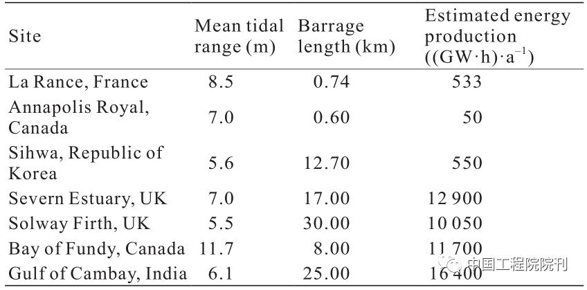 潮差是在一个潮汐周期内,相邻高潮位与低潮位之间的差值。潮汐磨坊起源于公元早期的几个世纪,考古学家指出,潮汐磨坊早在罗马人建立伦敦时和公元6世纪的爱尔兰就已出现。现代版潮汐磨坊就是潮堰和潮汐潟湖。潮堰是低水头水利发电系统,它横跨在河口处而形成潟湖。潮差形成的水头差通过轴流式涡轮机产生电能。表1列举了世界上不同的潮堰类型。