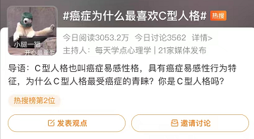 近日,一则关于#癌症为什么最喜欢C型人格#的话题冲上微博热搜,引发众多网友热议。