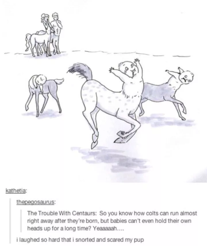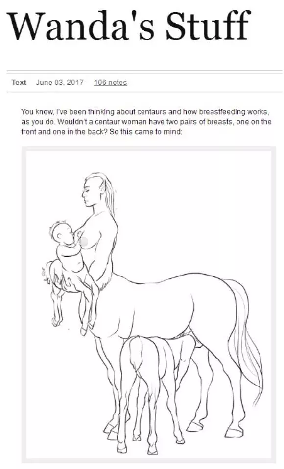 “半人马下面的马乳房会像上面的人乳房那样产奶吗?——@MJ在聊到哈利波特里缺少女性半人马时说。”