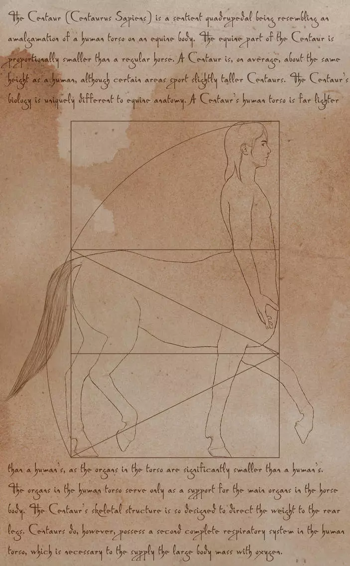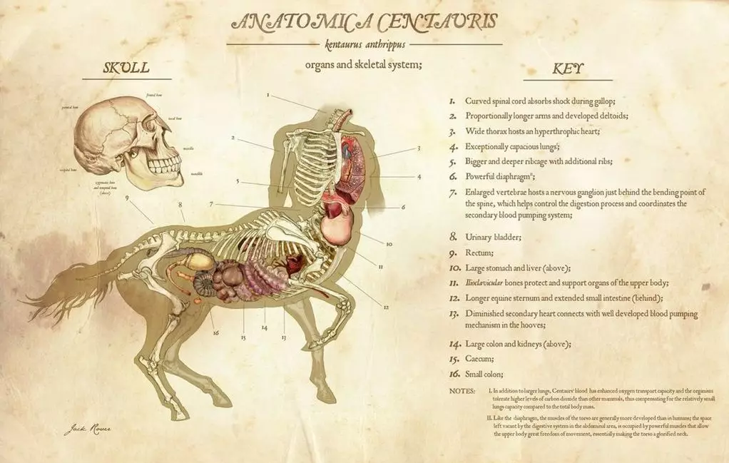“人马身体结构合理性”的支持者以人类和马类生物结构为基础,通过一个个精密考究的解剖图试图解释着,一套内脏系统在两个腔室中完全可以和平共存。