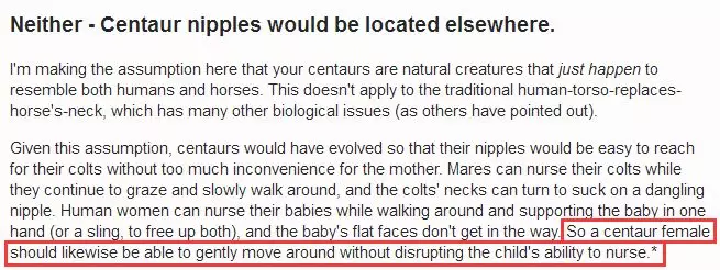 基于这种观点,从“解放生产力”和“保障安全”的两个层面考量,经得起进化论推敲的半人马种群只有可能是通过马乳哺乳——因为如果用人乳哺乳的话半人马妈妈很难靠自己的力量支撑人马宝宝的体重。由于幼儿半人马的身高很难达到人体直立时的乳房高度,站立哺乳的方法也很难行得通。