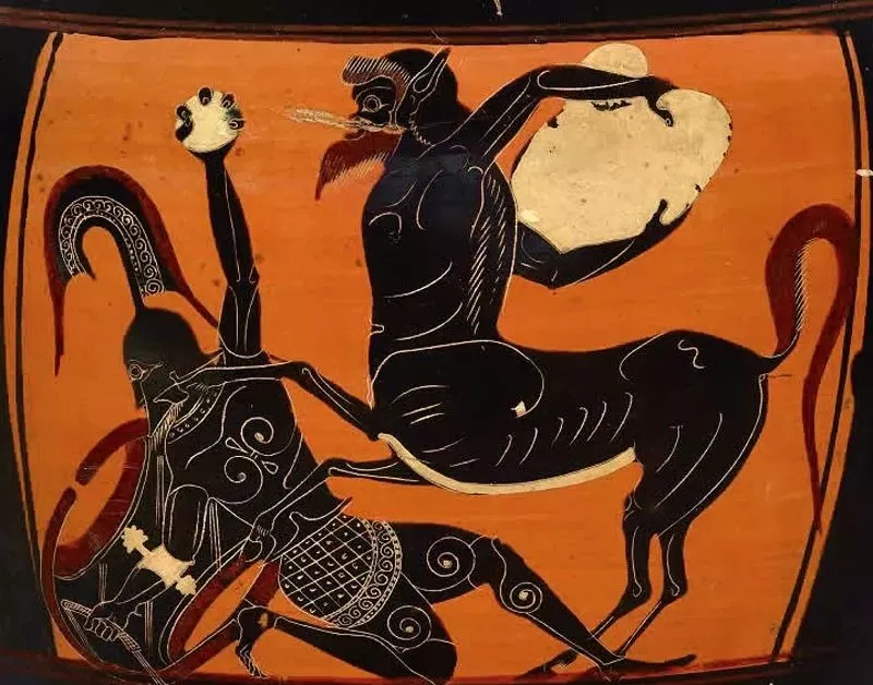 古希腊陶器拓印《半人马族与拉皮斯人的战争》(公元前 520 - 500年)/画中人类与半人马手中石块的相对大小,是为了突出半人马的超自然力量