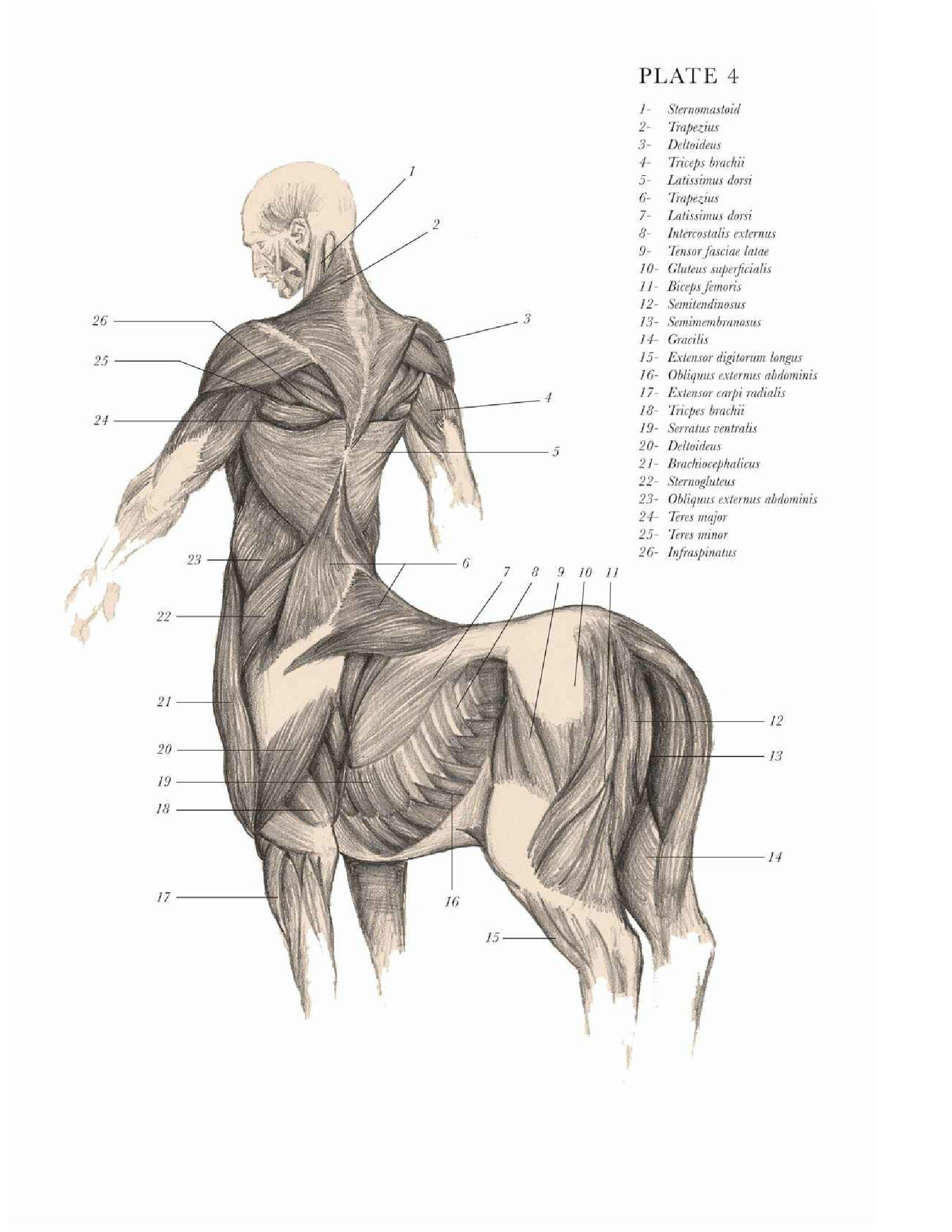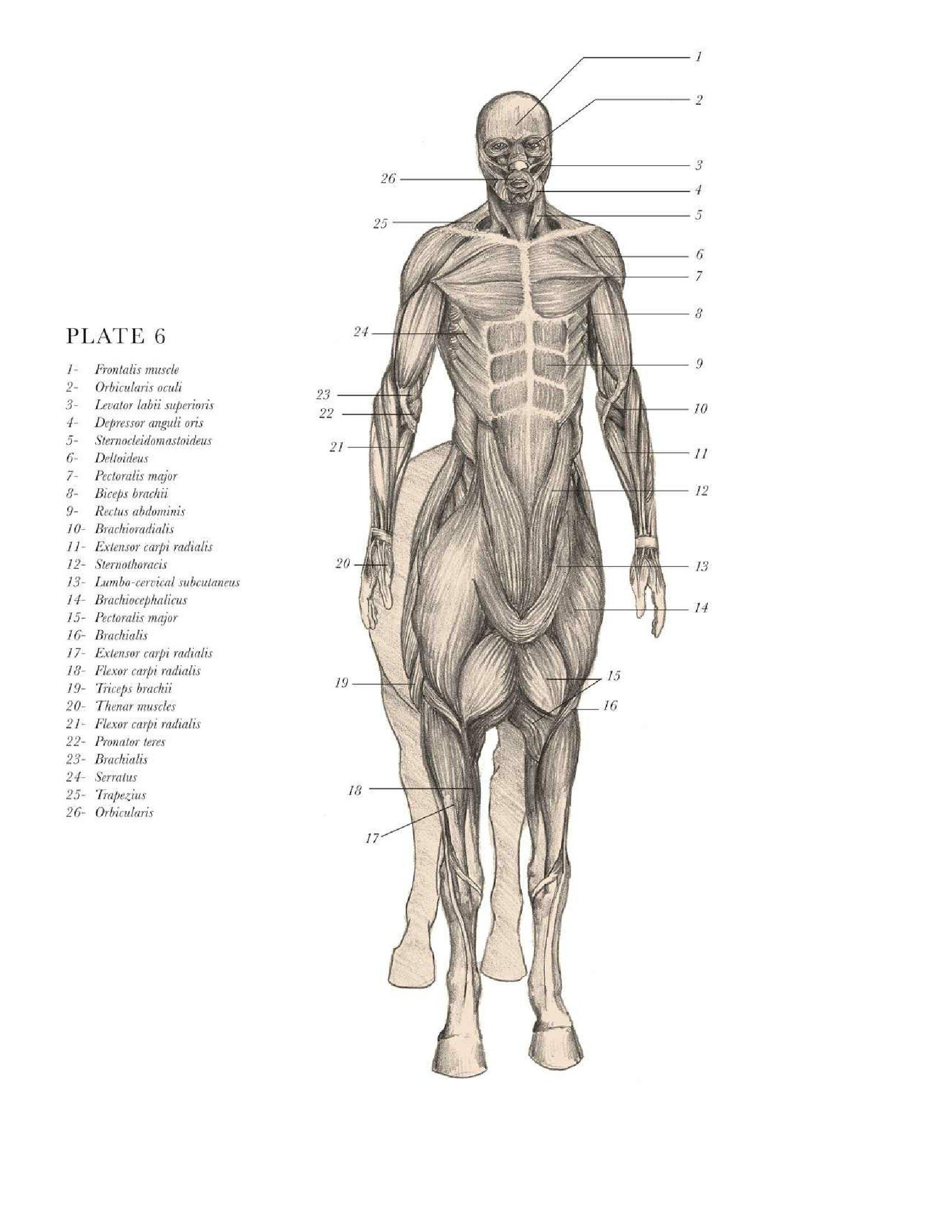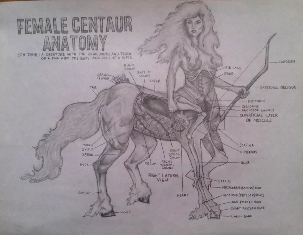 通常来说,他们都会把人身部分扩展成人马的胸腔,马身部分扩展成腹腔,中间的连接处有一层厚厚的支撑横膈膜进行分割。被解构的人马有更长的肺,臃肿的消化系统,保留着人的12对、马的18对肋骨,而肥厚的心脏则不得不被搬到没有肋骨保护的交接处。