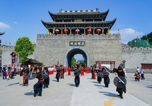 大明边城景区,划分为边城广场演艺区、边城市井文化区、边城军事体验区、水师龙舟训练营、水战乐园区、大明水寨锦江渔村、大明酒庄等八大文化体验区块,涵盖“吃住行游购娱”等旅游功能。