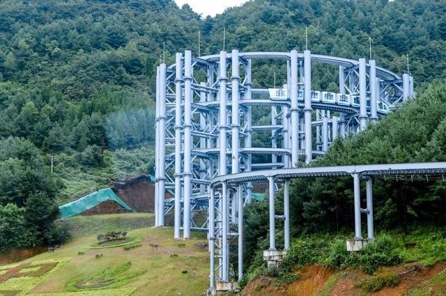 建于野玉海景区内的观光火车游览专线轨道全长约 11 千米,全程高差为 220 米,全部应用架设钢梁结构。其中螺旋观景段,轨道为三层半螺旋式结构、立柱高达 47 米。当车辆行驶至螺旋段时,就会惊现“高铁爬楼”奇观。