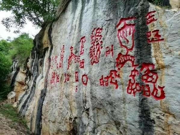 红崖古迹,又称红崖碑、红崖天书,位于安顺以西50公里黄果树晒甲山上,为我国八大神秘文字之一。一壁长达百米,高30米的巨大浅红色石屏上,有二十余个红字,非楷非隶,排列不齐。奥妙难解的文字成为千古之谜。红崖古迹也被誉为“黔中第一奇迹”,清代以来,中外学者对其考察研究,掀起多次破译热潮,成为名噪中外的“红崖文化”现象。