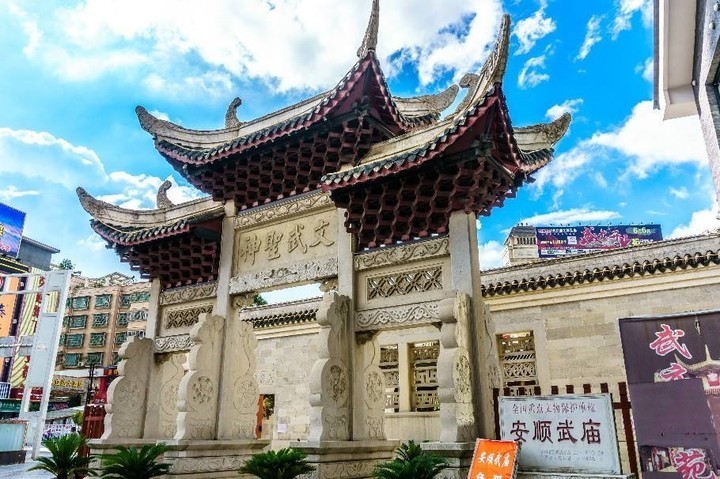 安顺武庙是有着600余年历史的全国重点文物保护单位,位于安顺市区内城老大十字东北角,始建于明洪武十五年(1382年),原名寿亭侯祠,后改称关帝庙。清康熙五年(公元1666年)改建为武庙。在民国八年(1919年)因将关羽、岳飞合祀,又称关岳庙。但安顺人一直称其“安顺武庙”。