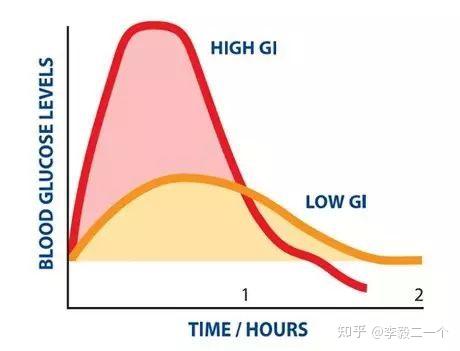 低GI食物具有更强的饱腹感且能维持更长时间,而高GI食物中的碳水化合物被机体迅速吸收,引起血糖和胰岛素的上下波动,血糖和胰岛素水平快速降低后引起饥饿增强,从而再次摄食,长期便会造成营养过量,从而发生肥胖。