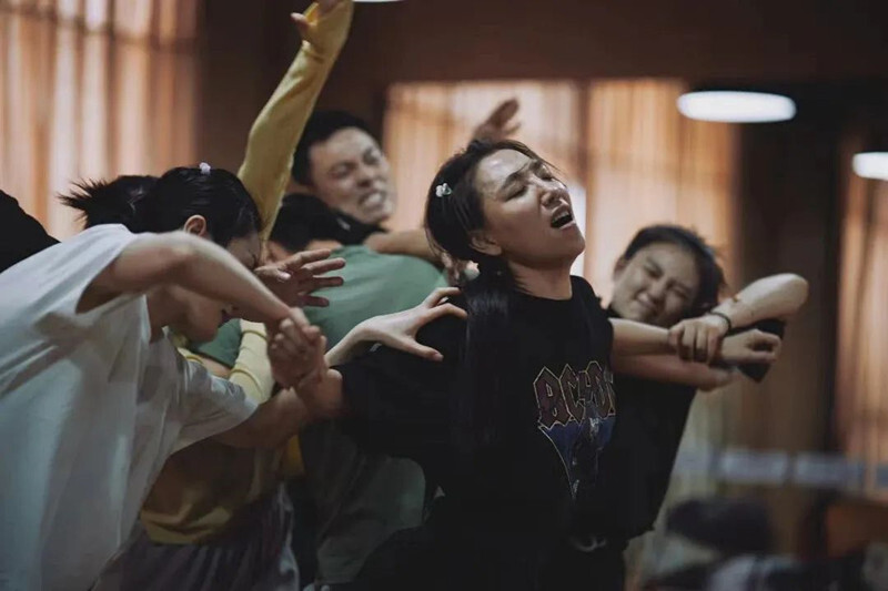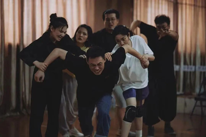 三拓旗剧团的“形体剧”在观众之间颇有口碑,导演赵淼在《回廊亭杀人事件》中依然采用大量肢体表现来推动剧情、展现剧中人的潜台词和内心独白。据赵淼介绍,他按照3-5分钟为一个层面设计每一场戏,在34场戏中,每隔5分钟会发生一个事件。他借由肢体,推进剧情,牢牢抓住观众的注意力,并利用符号性的隐喻做细节铺垫,满足观众的好奇心理。