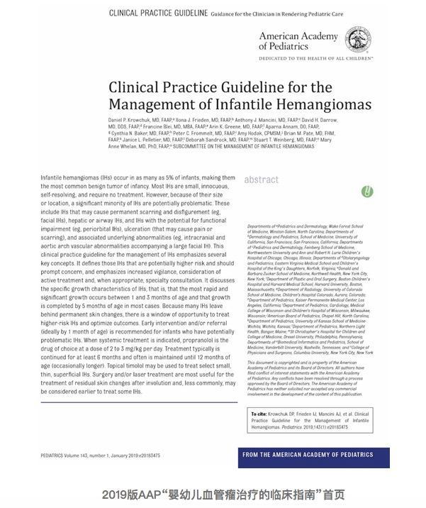 近日,华西医院小儿外科吉毅教授研究成果被美国儿科协会(American academy of pediatrics, AAP)最新制定的2019版婴幼儿血管瘤临床治疗指南(Clinical Practice Guideline for the Management of Infantile Hemangiomas)收录。这标志着其团队的研究成果受到了国外同行的高度认可;也表明在婴幼儿血管瘤的治疗方面,吉毅教授团队走在世界前列。