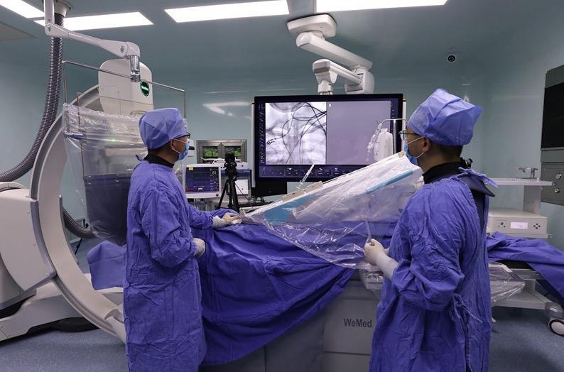 日前,首都医科大学附属北京天坛医院导管室内进行了我国首例机器人辅助全脑血管造影手术。