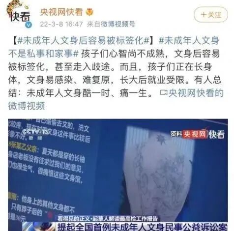在央视新闻 “解读最高检工作报告”中,最高人民检察院办公厅主任马骐表示,未成年人文身不是私事,也不是家事,而是关系到未成年人身心健康的大事。孩子们心智尚不成熟,文身后容易被标签化,甚至走入歧途。