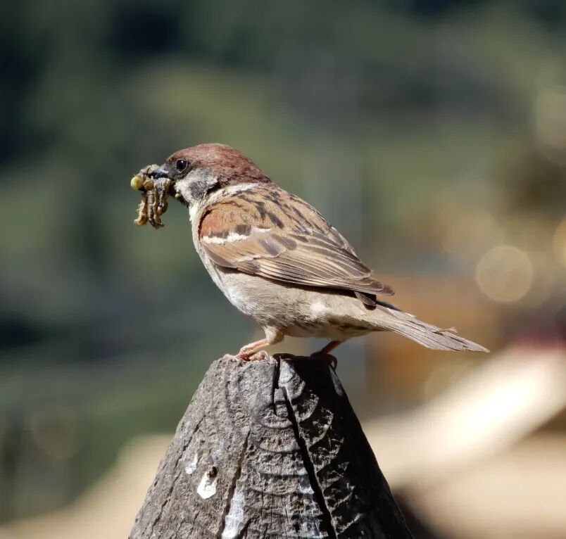 一说到鸟呢,可能大家想起来儿时或者说是五六十年代还在打麻雀,麻雀何罪之有?你看我这里照了一张照片,就是麻雀,你看它一嘴叼的什么?全是虫子,它为什么叼这么多虫子呢?因为麻雀在繁殖期的时候,100%是吃虫子的,所以麻雀也是人类的好朋友。全世界的鸟类我用这样几句话来描述,它们是免费的、持续的、美丽的、无害的生态维持大军。你看它们这么好,遗憾的是呢,我们一些人却恩将仇报,热衷于去抓鸟、养鸟、杀鸟,甚至吃鸟,换来的结果最终是害了自己。所以人和鸟的因果关系,其实唐诗里头有一句道出了人和鸟的因果关系,我一说你就知道了——千山鸟飞绝,结果是什么?万径人踪灭。