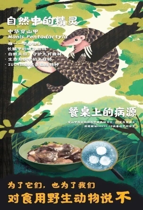 还记得不,非典之后扑杀了1万多只果子狸。你说动物又何罪之有呢?我经常在讲课的时候给孩子们放这个照片,什么照片呀?就是一只公的穿山甲背着孩子,那么配这个照片呢,我是让大家看看穿山甲的眼神,同时还要听听穿山甲的自白,什么自白呢?我给小穿山甲编了一首歌,什么歌呀?带引号的“吉祥三宝”:阿爸,我的妈妈为啥要被人抓?吃啊;他们是否还要杀我全家?可能;难道人类不懂天理报应?理应知道啊。所以还是那句话,管住嘴。