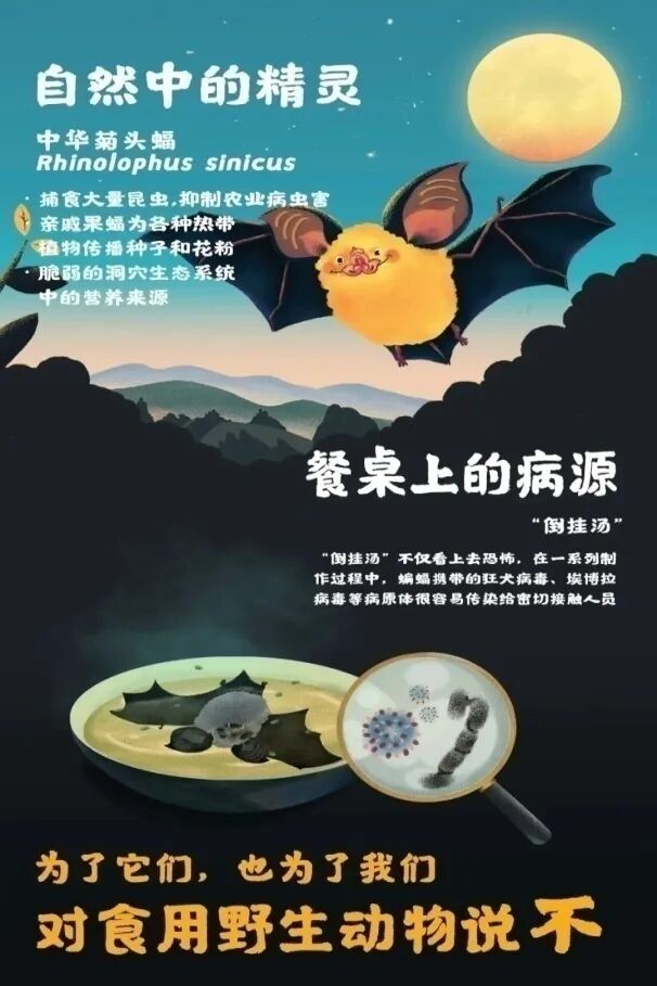 大家听说过SARS,当时说是来自果子狸,MERS中东呼吸综合症来自谁呀?来自骆驼。埃博拉病毒来自谁呀?来自蝙蝠。艾滋病病毒来自谁呀?来自猿猴。你看其实病毒、病菌比人类在地球的历史还要长,它们本来就寄生在野生动物的身上,跟你没关系,但是你非要去吃它、去抓它、去养它、去运它,所以我说千万不要触碰底线,触碰底线的结果就是上两院。哪两院?一个法院,违法犯罪了,一个是上医院,容易得病。