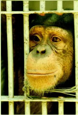 现在你看我给大家展示的是我去德国慕尼黑动物园拍的马可波罗羊,你看像不像在山地?还有雪。其实我多年饲养动物,我心上有一种负疚感,特别是当年我饲养黑猩猩的时候,你看这张照片,它在笼舍中露出一个脸。我今天就说它们何罪之有呢?可是当年我当饲养员的时候,腰里穿着一串钥匙在它们面前走来走去的,它们在笼舍中有时候伸出大爪子,有一种需要被关怀的渴求,所以我就觉得它们何罪之有呢?但却被判了无期徒刑。