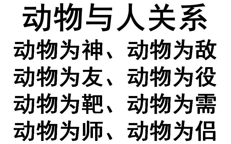 好了,关于《动物与人那些事》的讲座上来先说动物与人的关系。我从八个方面,就是动物为神、动物为敌、动物为友、动物为役、动物为靶、动物为需、动物为师、动物为侣。现在我就一一介绍。