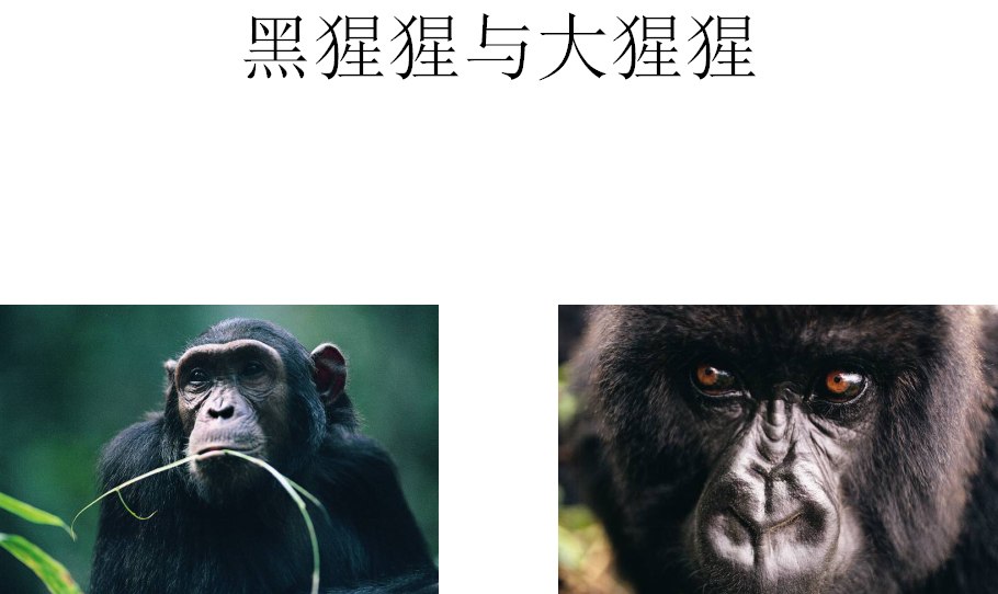 其次,人类在进化的过程中就像离不开水、离不开空气一样,也始终离不开动物。分类学就像一棵树一样,我们管它叫分类树,人类属于动物界,属于脊索动物门,属于哺乳纲,属于灵长目,属于类人猿中的人科、人属、人种。说到类人猿,我这里就要给大家介绍两种,刚才说到和人类亲缘关系最近的是黑猩猩。同时我在这儿展示的还有另外一个形象,是谁呢?就是这位,大猩猩。一说大猩猩,可能有的朋友就说,我知道大猩猩。它这是在干嘛呢?它是在炫耀自己,或者叫做捶胸顿足、耀武扬威,实际上这是它的一种身体语言,英文叫“Body Language”,就是“身体语言”。大猩猩激动的时候就这样。你要到动物园去,可能发现大猩猩、黑猩猩、黄猩猩都在同一个馆,叫“猩猩馆”,你就认为它们关系很近。实际上我要告诉你黑猩猩和大猩猩的关系还远不如黑猩猩和人类的亲缘关系近呢。