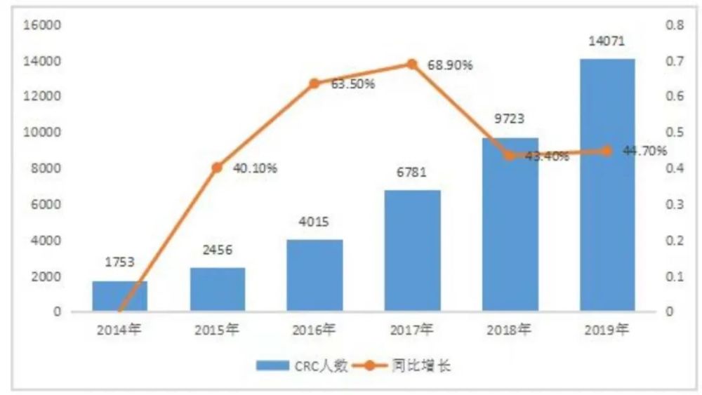 据中国CRC行业蓝皮书发布的数据显示,临床协调员数量在2014年至2019年这六年间,从1753人扩张到14071人。