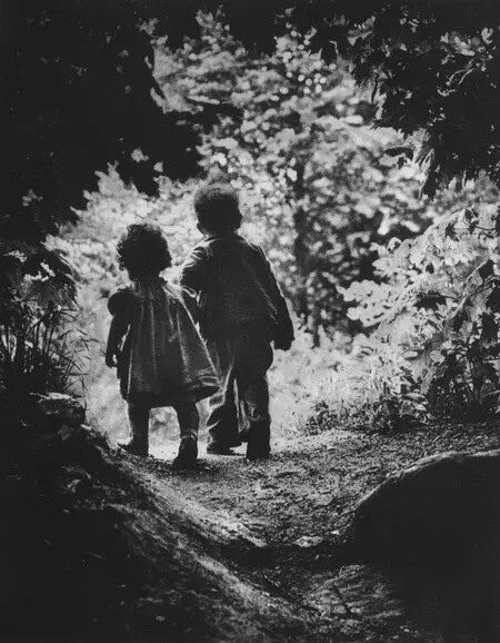 这是尤金·史密斯(W.Eugene Smith),在拍照被炸弹炸伤之后重新拿起相机拍摄的自己的儿子和女儿步向花园的照片。