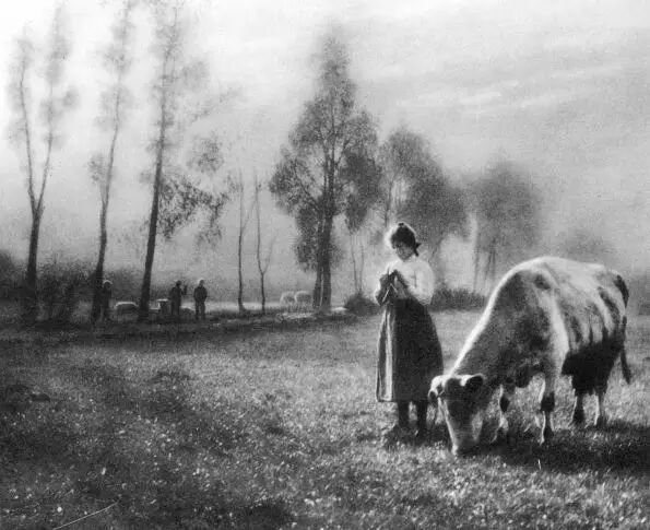这张有着米勒(Jean-FrancoisMillet)的画作《晚祷》意象的,是比利时摄影家米松(Leonard Misonne)拍摄的,他以前一直被当成一个沙龙摄影爱好,直到后来才被重视。所以摄影的职业与业余之间的关系不是很清楚,有时候业余摄影家更能触到他的乡愁情怀,而职业摄影家碰触到的多是时代中的社会事件,比较时事的那一面,可是社会事件跟乡土之间那种永恒的日常往往是脱节的,一个社会事件过了就消失了,可是一个乡下的日常生活中包含的内涵更能经得起时间的考验。像这张照片虽然是二十世纪初拍摄的,但仍然存在着对田野的向往,对自然的缅怀,还有对一切的存在油然而生的宗教情怀。我相信米松是有着这样的眼睛和心,才能拍出这种画面。