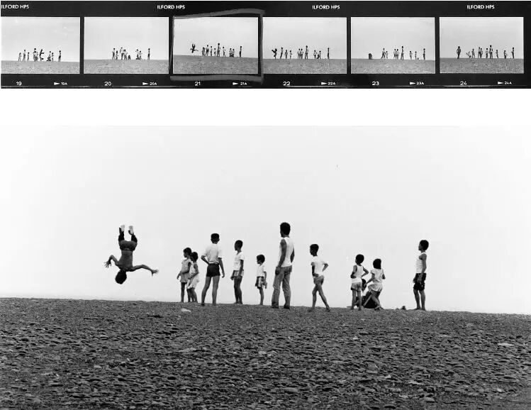 我不是说我那么行拍出这张照片,而是我拍照片时一点把握都没有,因为当时的情况是非常紧张的,旁边就有一个拿枪的警卫。这是在军事禁区,管制严格,几乎是一个地图上都不存在的地方,因此不能拍摄,我们只是误闯,警卫要求我们通行前把所有摄影器材留下来。我们正要把我们的摄影器材交给警卫,这时候我看到这一幕,就是小孩子不停地翻跟斗,在我看来不只是小孩子翻跟斗,而是这个重复的动作就好像是颠倒人生。人在土地上的存在是生老病死,来自土地回到土地,因此这张照片也变成《人与土地》的封面和最被大家记住的作品。