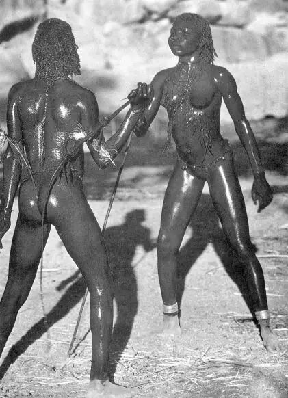 这一张照片比较特别,这个摄影师叫莱妮·里芬施塔尔(Leni Riefenstahl),她是替希特勒拍摄纪录片,后来被审判的摄影师。她替纳粹拍摄宣传影片使她入行,但是她拍努巴原住民拍得真好,她为努巴这个不受外界干扰的原生态的人种做的全纪录令人叹为观止,她同时也是个深海潜水家。