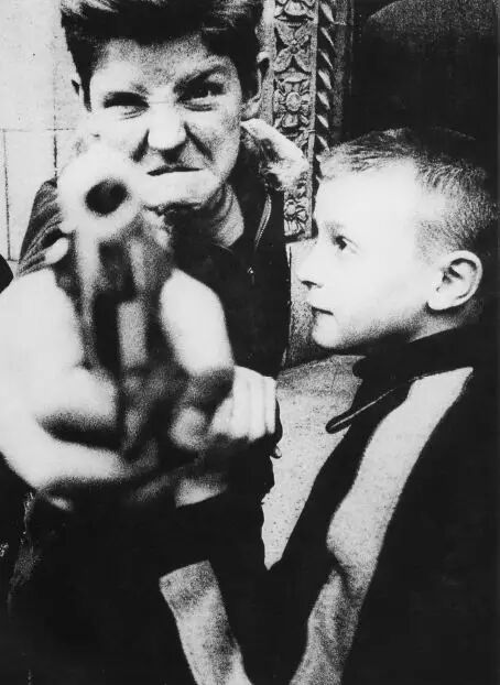 我现在坦白从实招来,因为熟悉我文风的人都很熟悉我,知道我是个温暖的人,我的文风很简白,可是这张给人一种突然要刺激人眼球之感。这张照片是美国摄影家威廉·克莱因(William Klein)的名作《枪》,一个小孩子拿着玩具枪对着摄影师,因为他认为摄影师拿的照相机就是枪,所以他举起玩具枪反击。