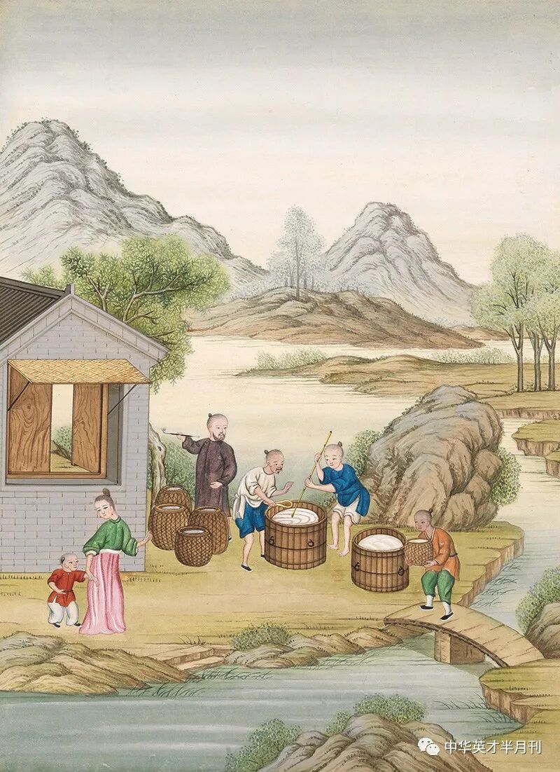造竹纸家庭作坊里正在进行“搅竹子”加工工艺(Michel Benoist手绘本,1775年)