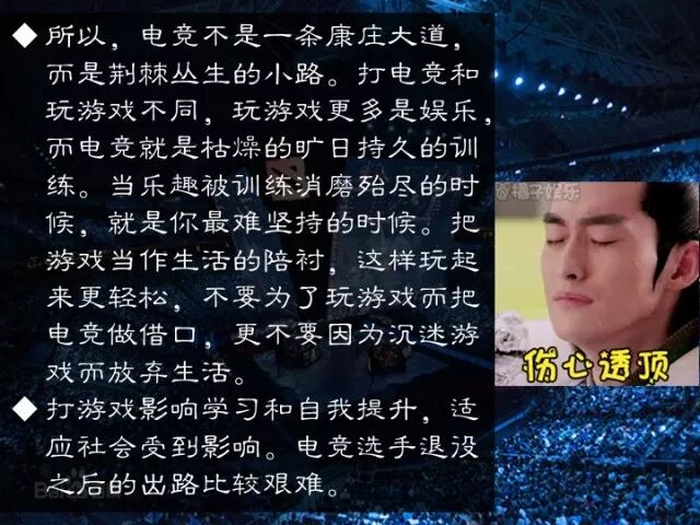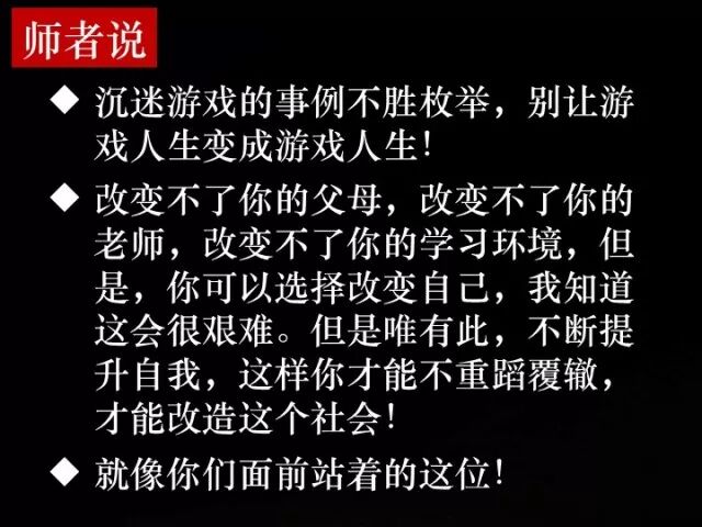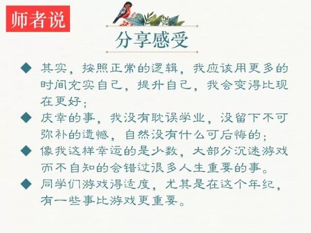之所以老师能在这里和你们分享我玩游戏的点点滴滴,很大程度上是因为我没有因为玩游戏而耽误学业。而“我在每一个阶段一起玩游戏的同学都几乎耽误了学业,初中同学没有考起高中,高中同学没有考起好的大学,只有我一切相对比较顺利,没办法,优秀,哈哈”。这也是为什么家长们、老师们反对你们玩游戏的原因。我始终对学习保有热忱,所以没有留下大的遗憾。但如果我把更多的时间用在学习上呢,说不定我会变得更好,谁知道呢。只不过,这一切对我来说已经不重要了。对你们来说,这一切,太重要了。