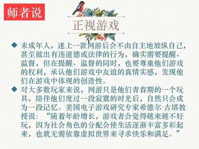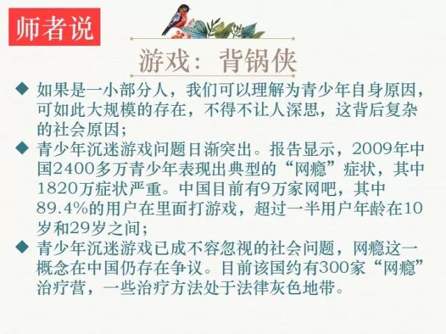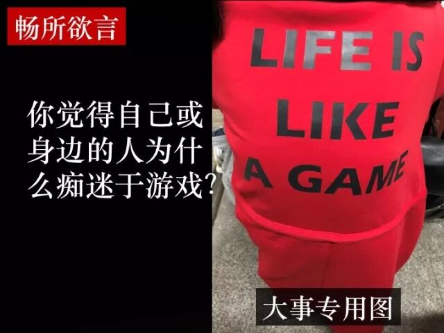 在上完上一节主题班会“洗脑与反洗脑”之后,我突发奇想,请他们来决定班会的主题,请同学们想好主题,再分类投票,得票最多的是“讲述我的故事”,最终被机智的我pass掉了,其它得票率比较多的有:电子竞技(游戏)、心理问题、中国电影、不为人知的历史、未来等,我将争取择机逐一对以上主题进行分享。根据学生当前实际,便优先选择了本期主题《游戏内外的人生》。
