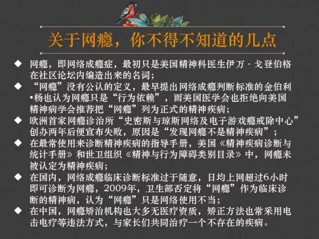 “治疗网瘾”遍及全国。特别标注:近日,世界卫生组织已将网瘾列入精神类疾病,但争议很大。