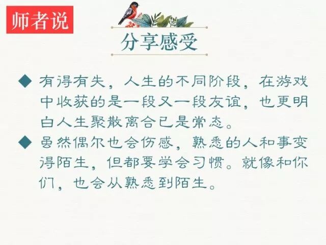 请同学们分享他们怎么理解“人生就像一场游戏”,各人理解不一,答案也五花八门。有同学说,我们人生就像游戏一样,扮演着各种各样的角色;有同学说,人生就像游戏有输有赢;有同学说,人生就像游戏,有开始有结束......