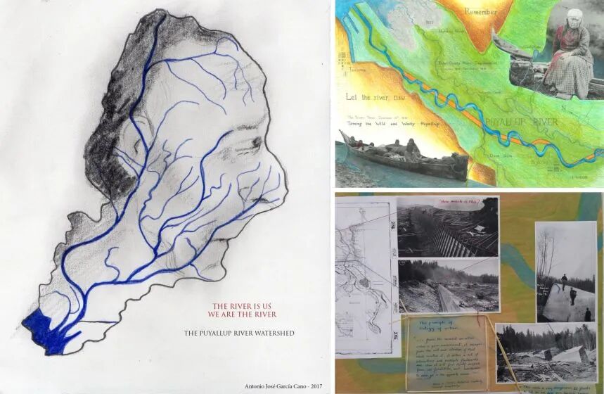 “伊斯库尔纳项目”的手绘地图。经过这两个项目,我认为这是制定适应和缓解气候变化战略的理想之地。因此,我在《生态科学》杂志上发表了一篇文章,内容涉及如何促进当前河流,河流的最后弯道和灌溉渠之间的连通性,以适应气候变化的不同影响。该系统可以围绕穆尔西亚市,并产生一条绿色的走廊,调节温度,提供庇护所,产生氧气并吸收二氧化碳。此外,如果我们消除了部分河堤并产生了自然区域以进行洪水泛滥,并且我们还部分地打开了旧河道,那么我们可以不再惧怕洪水并以此改善生活。Puyallup项目(2016-2017,美国华盛顿州塔科马)去年,在富布赖特奖学金的支持下,我成为华盛顿-塔科马大学的艺术家和博士后研究员。以下是在此期间开发的一个艺术项目,这个项与社区和科学家联合完成,我们收集关于Puyallup河的记忆,照片,地图和其他记忆的过程,以便了解社区与河的关系。